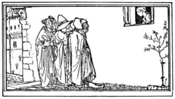 The wedding-feast was beginning when in walked the three women, attired in the most wonderful dresses. The bride greeted them, and said, "Welcome, dear cousins," but the bridgroom could not help exclaiming, "How came you to have such ugly friends."