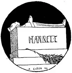 [A black-robed and black winged Angel becomes visible. He is great, strong, and beautiful, and bears a long serpentine sword, the hilt of which is draped in black gauze. Grave and silent, he sits beside the stove and gazes at Hannele, calmly and immovably. A white, dreamlike light fills the room.