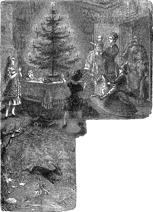 “We know, we know,” sang the sparrows; “we have looked in at the windows of the houses in the town, and we know what is done with them. They are dressed up in the most splendid manner. We have seen them standing in the middle of a warm room, and adorned with all sorts of beautiful things,—honey cakes, gilded apples, playthings, and many hundreds of wax tapers.”