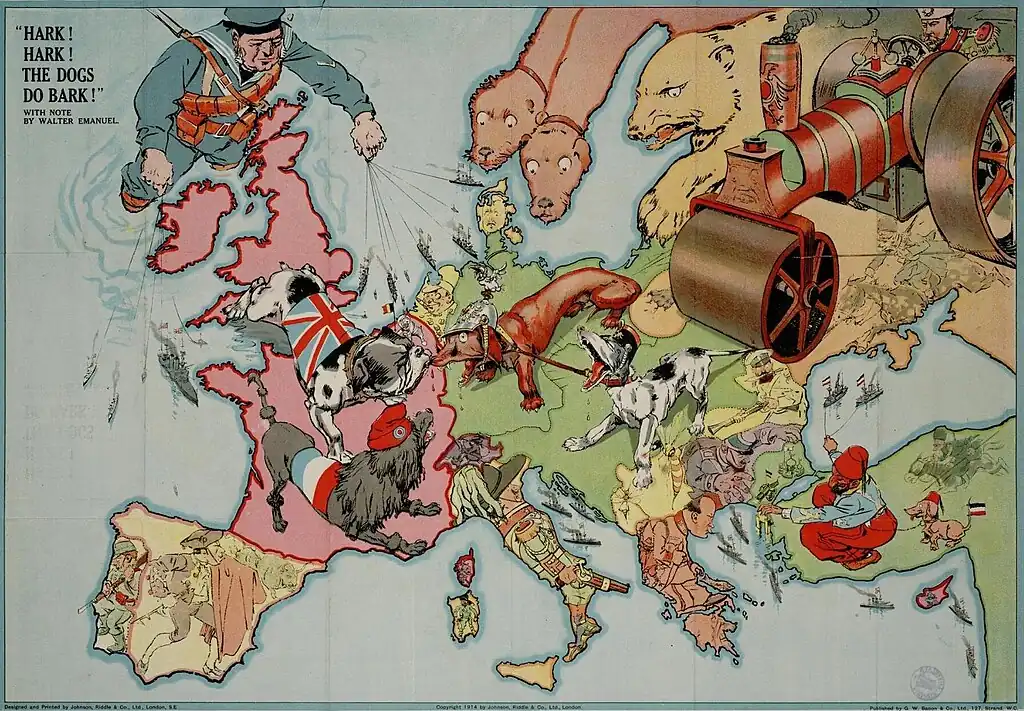 The Dogs of War are loose in Europe, and a nice noise they are making! It was started by a Dachshund that is thought to have gone mad—though there was so much method in his madness that this is doubtful. [Note for the ignorant: The German for Dog is Hund. The English for German in Hun. Dachshunds means badger-dog—and he is sometimes more badgered than he likes.] Mated with the Dachshund, for better or for worse, was an Austrian Mongrel. By the fine unwritten law of Dogdom big dogs never attack little ones. There are, however, scallywags in every community, and, egged on by the Dachshund for private ends, the Mongrel started bullying a little Servian. And then the fat was in the fire, for the little Servian had a great big friend in the form of a Russian Bear, and he stood up for his pal. And that was what the Dachshund wanted. He hoped that a big row would ensue, and in the confusion he intended to steal a bone or two that he had had his eye on for some time. He got what he wanted—and a little more. For the Russian Bear had friends, too. There was a very game little Belgian Griffon, and there was a great big French Poodle, a smart dandified fellow, and there was a Bulldog. Rather a sleepy chap this last one, and the Dachshund despised him because he was not always yapping and snarling. But the Bulldog has a habit of sleeping with one eye open, and, when he is roused, he grips and won't let go.