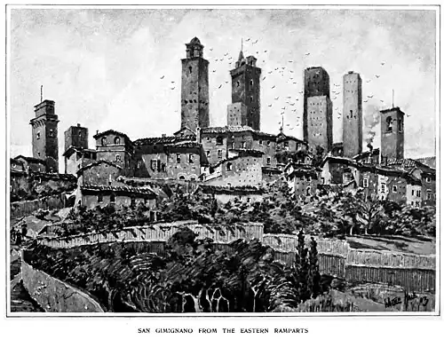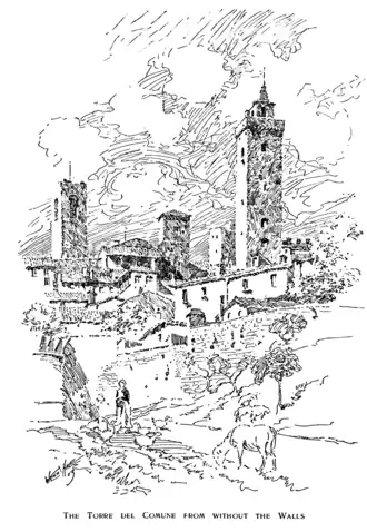 Apart from the joy of speculation, there was the beauty of the piazza itself. It is not every one whose summer-hotel windows look into a flat-iron square that has not changed one whit in four hundred years. There was a well near the point of the iron, with deep grooves worn in the stone sides from the ropes of centuries—that was the village club, and the sole ornament of the gravelled open space. Tall buildings, purely mediæval, defined the flat-iron; they had once been palaces, though the occupants probably stabled their horses on the ground floor in those days, as they do now. At our left, from a balcony as gay as sedate geraniums will permit, rose the Cortese tower, and across the square by the archway was the rugged monument of hate of the Cinatti—names that convey nothing to the dilettante in historical research, save a complacent satisfaction in the knowing of them. However, at right angles with the hotel, flanking the drug and tobacco shop, were the two low towers of the Ardinghelli, the Guelphs who began it all, and, farther on, beyond the church, were the two tall towers of the Ghibelline Salvucci, who outdid their neighbors by many feet, and lashed their opponents into a stone-mason's boom. It was not until we had drunk our chocolate and devoured seven biscuits at the café on the corner that we learned our own hotel to be part of the ancient Palazzo del Podesta (the home of the Mayor, we would say), whose campanile, with the clock on one side, became the measure for all extravagant excrescences. From that hour we viewed the results of this ancient rivalry in a different light, and with some degree of anxiety whenever we came upon a new one of unusual height. At various angles of the hilly town our tower was undoubtedly squat; in other spots it soared beautifully, and in one charming locality by the penitentiary it was higher even than the Torre del Comune, which is on a hill and has every advantage, as well as being an official tower and privileged to grow as tall as it pleased.