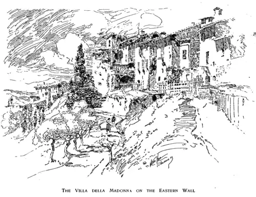 "In the path of the tourists' search-light" does not necessarily mean within three minutes' walk from the station. The traveller is so much of an epicure in these days that inaccessibility but renders more palatable the feast of the unusual, and to him the nine-mile drive through the countryside increases the value of his discovery. Since Queen Victoria was driven over these hills to see what a mediæval town really should be, many have followed in her august wheel-tracks. We did not travel with the pomp of royalty, for Pogni was our single escort through this region. He was fat and sunshiny, and should have walked up the steep grades to save his horses, but did not. We had liked him from the moment he was discovered hissing at us from over the railroad fence. The cabbies, in certain Italian localities, are not allowed to shriek at possible "fares," but are permitted to attract attention by a polite "hiss!" And if there is anything funnier than twenty of these unfeathered geese emitting their war-cry from their perches, it deserves to be dramatized. Pogni, having two horses, hissed twice as loud as those having single cabs, and he sat in the shade of the only tree to do it, proving that he was a lucky man from birth, or a strong one. He was a good whip-cracker as well, and evidently a kind man, for his horses were impervious to the sound, and chose their own gait during the upward climb.