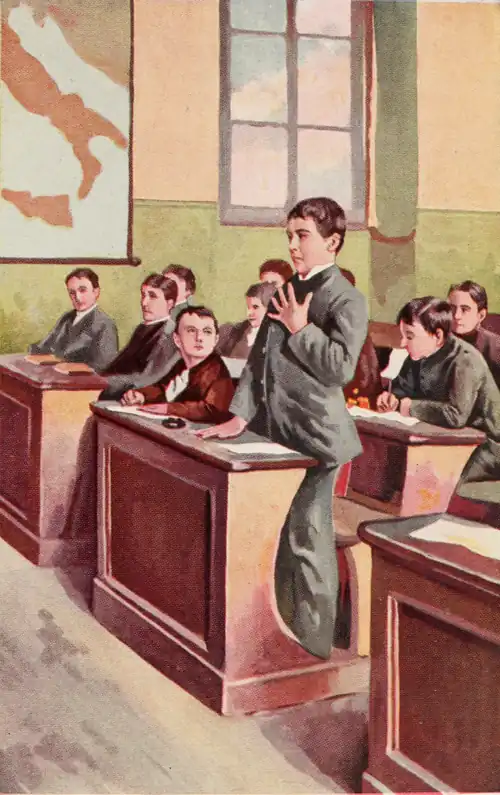 several of my classmates. Another one I am taken with is named Coretti, and he wears chocolate-colored trousers and a catskin cap: he is always jolly; he is the son of a huckster of wood, who was a soldier in the war of 1866, in the squadron of Prince Umberto, and they say that he has three medals. There is little Nelli, a poor hunchback, a weak boy, with a thin face. There is one who is very well dressed, who always wears fine Florentine plush, and is named Votini. On the bench in front of me there is a boy who is called Muratorino (“the little mason”) because his father is a mason: his face is as round as an apple, with a nose like a small ball; he possesses a special talent: he knows how to make a hare's face, and they all get him to do it, and then they laugh. He wears a little ragged cap, which he carries rolled up in his pocket like a handkerchief. Beside Muratorino sits Garoffi, a long, thin, silly fellow, with the nose and beak of a screech-owl, and very small eyes, who is always trading in little pens and images and match-boxes, and who writes the lesson on his nails, in order that he may read it on the sly. Then there is a young gentleman, Carlo Nobis, who seems very haughty; and he is between two boys I like,—one the son of a blacksmith, clad in a jacket which reaches to his knees, who is pale, as though from illness, who always has a frightened air, and who never laughs; and the other with red hair, who has a withered arm, and carries it hung in a sling from his neck; his father has gone away to America, and his mother goes about peddling pot-herbs. And there is another curious fellow,—my neighbor on the left,—Stardi—small and thickset, with no neck,—a gruff fellow, who speaks