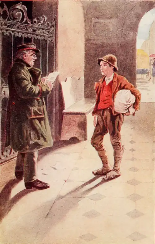 We went into the street. Crossi's father was there, a little to one side: a man with a black beard sprinkled with gray, badly dressed, and with a colorless, thoughtful face. Derossi shook Crossi's hand, in a way to attract attention, and said to him in a loud tone, “Farewell until we meet again, Crossi,”—and passed his hand under his chin. I did the same. But as he did so, Derossi turned crimson, and so did I; and Crossi's father gazed straight at us, with a kindly glance; but through it shone a look of distrust and doubt which made our hearts grow cold.