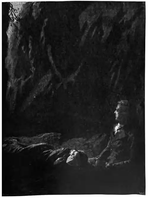 His arms were free—the sense of constraint was gone. And now the time went by almost as quickly as before it had lagged. He saw with surprise that the stars were extinguished; that his patch of sky had grown pearl grey. Sundry stirrings in the leafage without spoke of an awakening world. A bird piped. The walls of their prison began to take shape … He saw the white glimmer of her hand in the folds of the cloak … And then he knew he must, after all, have slept at his post, for the next thing he knew was coming to himself, with a great spasm, and seeing in a shaft of yellow sunlight, grey rock, brown earth, and Sidonia's golden head upon his knee. And, but a yard from her little, sandalled foot, the horrible black chasm!—O, shame! he had slept, and Death lurking for her! The sweat started on his forehead.