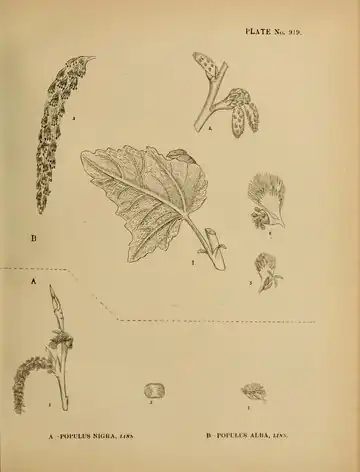 A lofty tree in Europe ; in India exceeding 40ft. (Brandis.) Leaf-buds, shoots and leaves beneath, white with cottony tomentum. Leaves oblong— ovate or broadly ovate, dull-green above, or orbicular, sinnately lobed or toothed, palmately on young shoots ; petiole l-2in., laterally compressed. Base 5-nerved, more or less cordate ; catkins hairy. Males 1½-4 ; stamens 6-10. Females slender shoots. Tips crenate, ciliate. Disk stellate ; stigmas 2-2, partate ; arms linear. Carpels pedicelled, 2-valved. Capsule lin., shortly pedicelled.