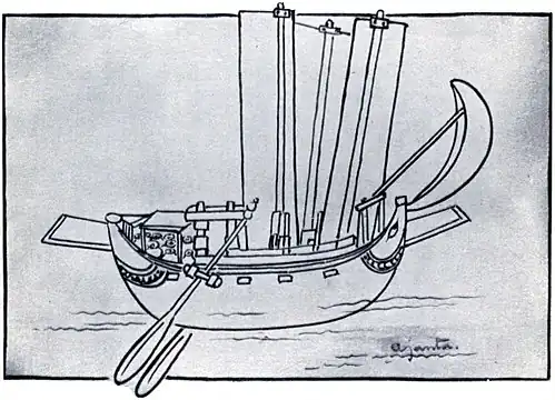 The representations of ships and boats in the Ajantā paintings are therefore rightly interpreted by Griffiths as only a "vivid testimony to the ancient foreign trade of India." Of the two representations herein reproduced, the first shows "a sea-going vessel with high stem and stern, with three oblong sails attached to as many upright masts. Each mast is surmounted by a truck, and there is carried a lug-sail. The jib is well filled with wind. A sort of bowsprit, projecting from a kind of gallows on deck, is indicated with the out-flying jib, square in form," like that borne till recent times by European vessels. The ship appears to be decked and has ports. Steering-oars hang in sockets or rowlocks on the quarter, and eyes are painted on the bows. There is also an oar behind; and under the awning are a number of jars, while two small platforms project fore and aft.[14] The vessel is of the Agramandirā type as defined in the Yuktikalpataru, our Sanskrit treatise on ships.