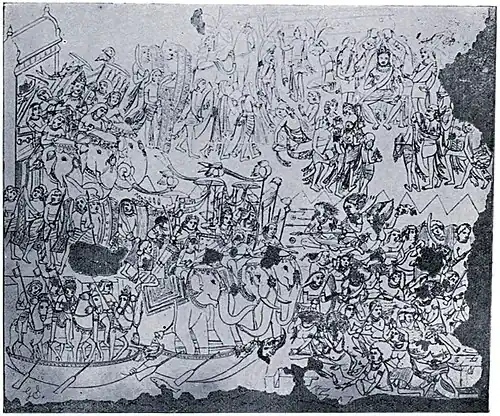The third representation from the Ajantā paintings reproduced here is that of the scene of the landing of Vijaya in Ceylon, with his army and fleet, and his installation. The circumstances of Vijaya's banishment from Bengal with all his followers and their families are fully set forth in the Pali works, Mahāwańso, Rājāvalliya, and the like. The fleet of Vijaya carried no less than 1,500 passengers. After touching at several places which, according to some authorities, lay on the western coast of the Deccan, the fleet reached the shores of Ceylon, approaching the island from the southern side. The date of Vijaya's landing in Ceylon is said to have been the very day on which another very important event happened in the far-off fatherland of Vijaya, for it was the day on which the Buddha attained the Nirvāṇa. Vijaya was next installed as king, and he became the founder of the "Great Dynasty."