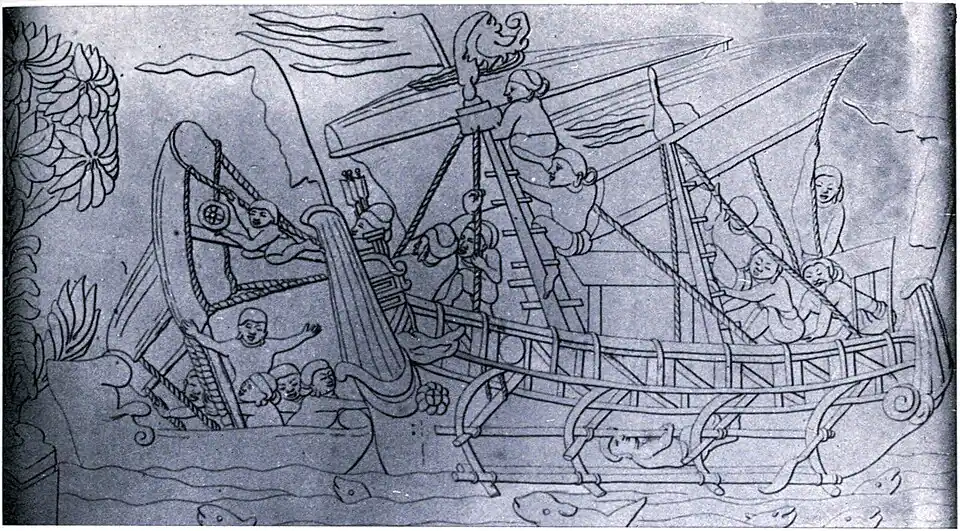 Reproduced from the frieze of the great Buddhist temple at Borobudur, Java, which dates probably from the 7th century A.D. About 600 A.D. there was a great migration from Guzarat in ancient India near the mouths of the Indus to the island of Java, due perhaps to the devastation of Upper India by Scythian tribes and to the drying up of the country.[21]