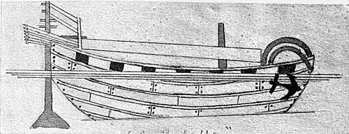 Lastly, Bowrey gives an account of the various kinds of ships and boats that were then built. The Massoola boats, used in lading and unlading ships or vessels, "are built very slight, having no timbers in them save 'thafts' to hold their sides together. Their planks are very broad and thin, sewed together with coir; they are flat-bottomed" and most proper for the Coromandel coast; for "all along the shore the sea runneth high and breaketh, to which they do buckle and also to the ground where they