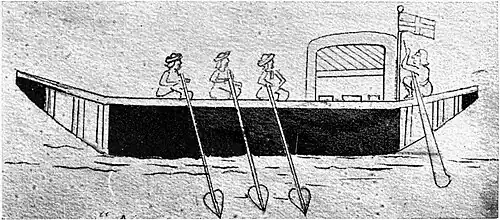 Dr. Fryer, who visited India about the year 1674, has also left some interesting details about Indian ships and boats. He describes the Mussoola as "a boat wherein ten men paddle, the two aftermost of whom are the steersmen, using their paddles instead of rudder: the boat is not strengthened with knee-timber, as ours are; the bended planks are sewed together with rope-yarn of the cocoe and caulked with dammar (a sort of rosin taken out of the sea) so artificially that it yields to every ambitious surf."[14] He describes catamarans as formed of "logs lashed to that advantage that they waft all their goods, only having a sail in their midst, and paddles to guide them." Dr. Fryer was landed at Masulipatam by one of the country boats, which he describes as being "as large as one of our ware-barges and almost of that mould, sailing with one sail like them, but paddling with paddles instead of spreads, and carry a great burden with little trouble; outliving either ship or English skiff over the bar."
