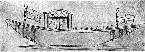 A BUDGAROO. strike."[12] There is another kind of boat called the catamaran, made of four, five, or six large pieces of buoyant timber "upon which they can lade three or four tons of weight." In Bengal, Bowrey noticed "great flat-bottomed vessels of an exceeding strength which are called Patellas and built very strong. Each of them will bring down 4,000, 5,000, or 6,000 Bengal maunds." Bowrey also mentions several sorts of boats that were in use on rivers. The Oloako boats are rowed some with four, some with six oars, and ply for a fare. A Budgaroo, a pleasure boat, was used by the upper classes. A Bajra was a kind of large boat, fairly clean, the centre of which formed a little room. The Purgoos which were seen for the most part between Hugli, Piplo, and Balesore were used for lading and unlading ships. "They will live a long time in the sea, being brought to anchor by the sterne, as their usual way is." Booras were "very floaty, light boats, rowing with twenty or thirty oars. These carry salt, pepper, and other goods from Hugli downwards, and some trade to Dacca with salt; they also serve for tow-boats for the ships bound up or down the river." Lastly, there were the "men-of-war prows" which were used in the Malaya Archipelago.[13]