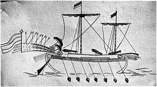 Bowrey refers to a sort of "ship-money" imposed by Nawab Shaista Khan of Bengal on the mercantile community to build up the naval defence or power of the country. Thus, not satisfied that all, both rich and poor, should bow to him, but wishing the ships upon the water should do the like, the Nawab would every year send down to the merchants in Hugli, Jessore, Pipli, and Balasore for a ship or two in each respective place of 400, 500, or 600 tons, to be very well built and fitted, even as if they were to voyage to sea, as also 10, 20, or 30 galleys for to attend them, the Moor's governors having strict orders to see them finished with all speed, and gunned and well manned, and sent up the Ganges as high as Dacca.[10]