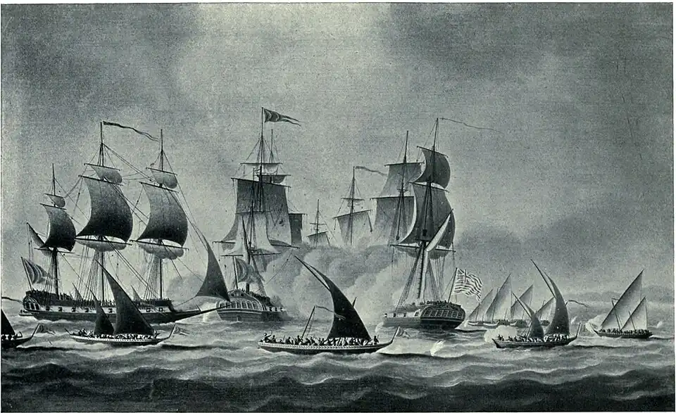 "MAHRATTA GRABS AND GALLIVATS ATTACKING AN ENGLISH SHIP."