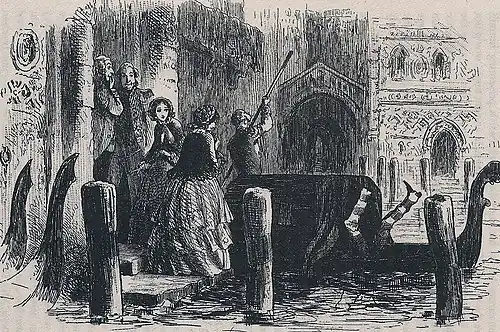 Little Dorrit would have been glad to make her visit to Mrs Gowan, alone; but as Fanny, who had not yet recovered from her Uncle’s protest, though it was four-and-twenty hours of age, pressingly offered her company, the two sisters stepped together into one of the gondolas under Mr Dorrit’s window, and, with the courier in attendance, were taken in high state to Mrs Gowan’s lodging. In truth, their state was rather too high for the lodging, which was, as Fanny complained, ‘fearfully out of the way,’ and which took them through a complexity of narrow streets of water, which the same lady disparaged as ‘mere ditches.’
