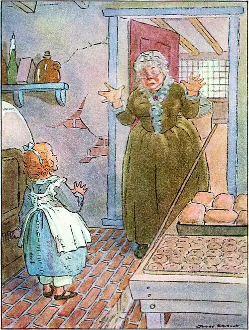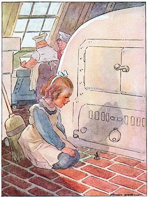 At first Anne’s little arms ached very much, for she had to sweep and clean up the bakery and the store each morning, but she soon grew accustomed to the hard work and sang as she swept. One morning as Anne swept in front of the big ovens she heard a creaky noise, like some one rocking a chair over a creaky board.