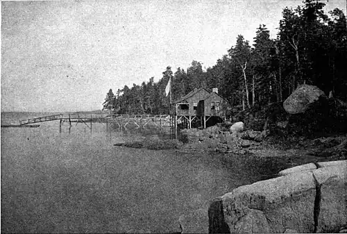 Close to the shore of the island the skiff ran round the point into the shallow water along the beach, and all at once in the distance the festooned lanterns of the Canoe Club came into view, so bright that one could distinguish the branches of the spruces in the red and yellow glare, and the moving crowd of people on the