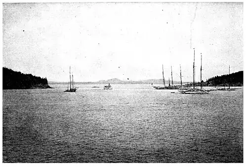 The distance from the landing, across the harbour, through the channel between Bar Island and Sheep Porcupine to the Canoe Club, is little over half a mile; but at night, amidst a crowd of steamers, large and small, row-boats, canoes, and sail-boats,—the latter all outside the channel,—it took twenty minutes to reach the place where the fireworks were to be.