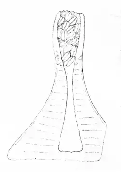 Griffith recognised the development of the embryo-sac in the nucellus of the ovule which he took to be naked, missing the very slightly indicated integument. He followed the pollen tube to the tip of the embryo-sac and the development of the endosperm in its upper portion, where the embryo appeared. He saw the growth of the endosperm leading to its complete protrusion from the ovule and inverting the embryo so that its cotyledons point to the surface. Further he saw the long, empty, absorbent caecum grow out from the hinder end of the embryo-sac into the massive base of the young seed.