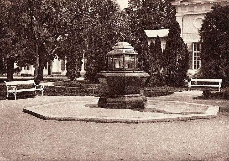 | Kreuzbrunn-Einblick mit Dr. Nehr-Denkmal. | Cross Spring. Look into the Interior with Dr. Nehr Monument. |