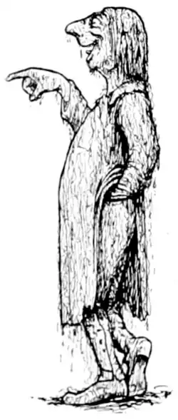 Well, one day, as she sat at her door paring potatoes, over the stile and up the path came a tall lad with a long nose and goggle eyes and his hands in his pockets.