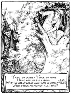 When she had gone some way she heard the witch coming after her. So she ran to the apple-tree and cried: