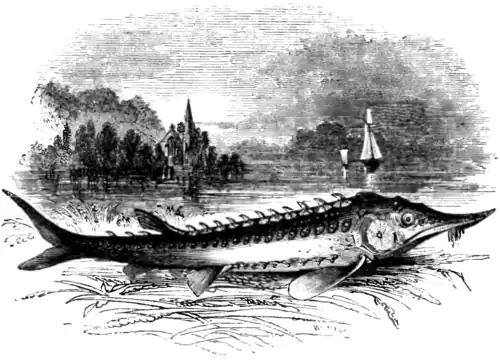 In addition to the characters already detailed, the Sturgeons have the snout more or less prolonged and pointed, and furnished, on its under surface, with several cirri or beards, which hang down in front of the tubular, protrusile mouth. The fins are rather small, and, with the exception of the pectorals, are all placed far behind. The flesh in general is wholesome and agreeable; the roe, which is of considerable bulk, is made into a substance called caviare, held in high estimation in some parts of Europe; isinglass of the best quality, is made of the inner coats of the large and thickened air-bladder; and the skin is sometimes made into leather, or prepared as a substitute for window-glass. Hence these fishes are the subjects of important fisheries, especially in the east of Europe. The Russian fisheries, on the Caspian Sea, are very valuable; three species inhabit that great inland lake,—the Common Sturgeon (Acipenser sturio), the Great Sturgeon (A. huso), and the Sevruga (A. helops). The number of fishes taken in a single season is immense; of the first species named, three hundred thousand; of the second, one hundred and three thousand; of the third, one million three hundred thousand; are considered as the annual average. The products of isinglass, and caviare, exclusive of the flesh, which is preserved in various ways, and is a valuable article of merchandise, are alone worth more than 100,000l. per annum.
