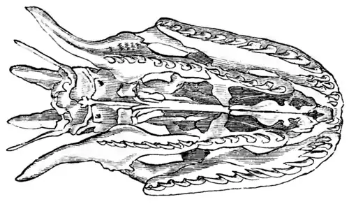 Both pairs of jaws, for the most part, are set with numerous slender acute teeth, having a double curve, and pointing backwards: the bones of the palate also are furnished with similar teeth, so that there are four nearly equal rows of teeth in the upper part of the mouth, and two in the lower. The mode of swallowing prey is as follows:—Some of the front teeth being struck into the victim, one side of the lower jaw is thrust forward as far as the ligaments will allow, when the teeth of that side take a fresh hold, which is retained, while the other side of the jaw performs a corresponding movement; thus by the alternate advance of the two sides of the jaw, which their excessive mobility admits, and by the backward inclination of the teeth allowing the food to move much more readily in one direction than another, this is gradually drawn into the throat, forcing asunder, and dislocating, as it were, all the bones of the mouth, as it proceeds, until at length it is deposited in the elastic and expansible gullet.