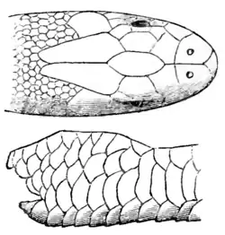 In this genus the head is depressed, almost oval, somewhat compressed before, and wider behind the eyes: the upper part is covered with small scaly plates, three of which (the vertical, and the two occipitals,) are larger than the rest; the scales of the body are lance-shaped, and keeled; the belly is clothed with broad shields, and those beneath the tail are arranged in a double series; the tail is short, and tapers abruptly; there are no pits or grooves in the scales before the eyes.