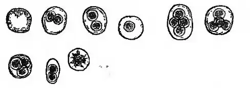 The various cells produced by budding may remain united like strings of beads. Collections of masses composed of four or more subdivisions (ascospores), which finally separate by rupture of the original cell wall, having thus become themselves independent cells, may be seen more rarely (endogenous division).