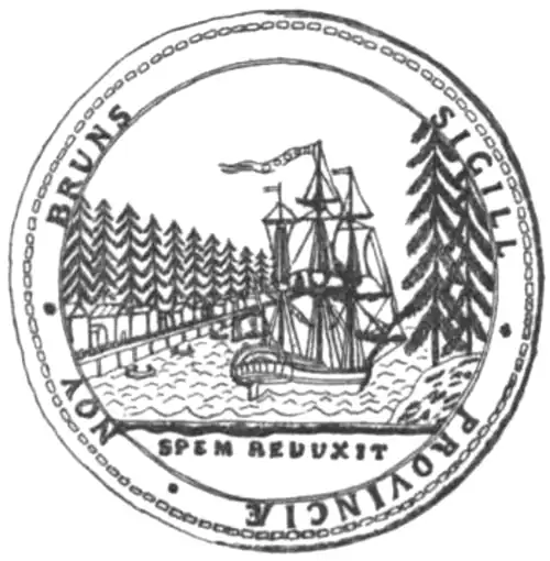 Brunswick," sent out from England by Lord Sydney, Secretary of State, to Governor Carleton, on Feb. 25, 1785, as we learn from a note in the Archives Report for 1895 (N.B. page 3). This seal, as was customary in those days, was impressed upon a thick disk of wax attached to its document by a band of tape. Upon the obverse side it bore the British Coat of Arms with the inscription Georgius Tertius dei gratia britanniarum rex fidei defensor, (George the Third, by the Grace of God King of the British Defender of the Faith). Upon the reverse it was engraved as shown upon the following cut, which is from a tracing of a photograph of an original, reduced to one-half the true size:
