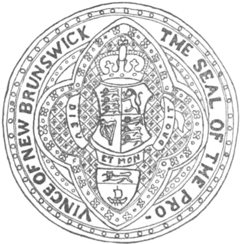 of arms, and surrounding the whole the words, the Seal of the Province of New Brunswick, (or which ever it was). Thus the seals of the provinces are alike except for the coat of arms and the province name. This seal for New Brunswick is that now in use, and a crude cut of it, made from a tracing of a photograph about the true size, here follows: