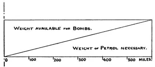 expressly for long distance raiding, will be essentially a relatively slow machine, since speed means engine weight; it must be, comparatively speaking, a relatively poor climber for the same reason. Again, it cannot afford to carry shield or armour, neither can weight be spared for a defensive gun armament. All these facts mean that as the distance to be raided becomes greater, defence will become more and more easy, and point to the conclusion that in actual warfare the maximum distance which can be effectively raided by aeroplane will be far less than the theoretical maximum aforesaid. Beyond this the opportunities for defensive counter