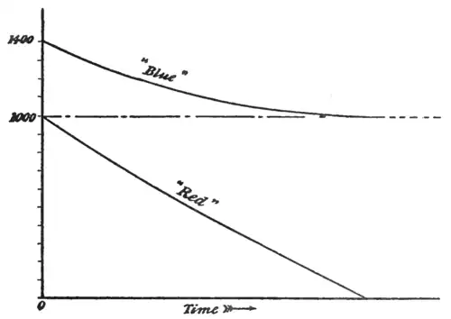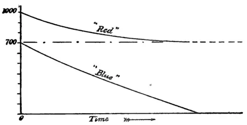 In Fig. 3a a case is given in which the "Red" force is inferior to the "Blue" in the relation 1 : √2 say, a "Red" force 1,000 strong meeting a "Blue" force 1,400 strong. Assuming they meet in a single pitched battle fought to a conclusion, the upper line will repre-
