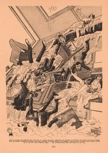 And so, rolling and tumbling over and over at a more and more rapid pace, the periods of hesitancy ever shorter and more abrupt, with ever louder creaking, crashing, clattering, tinkling, crunching noises, with people, furniture and a hundred other objects mixed up in an ever more helpless tangle ... the Perambulating Home proceeded on its way.