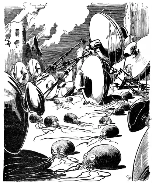 A mighty space it was, with gigantic machines here and there within it, huge mounds of material and strange shelter places. And, scattered about, some in their over-turned war-machines, some in the now rigid Handling Machines, and a dozen of them start and silent and laid in a row, were the Martians—dead!