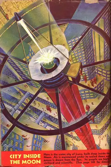 Here is the crater city of Luna, built deep inside the Moon. Air is maintained under its sealed dome and power is drawn from the Sun. its people are highly civilized and scientific. (See page 145 for details)