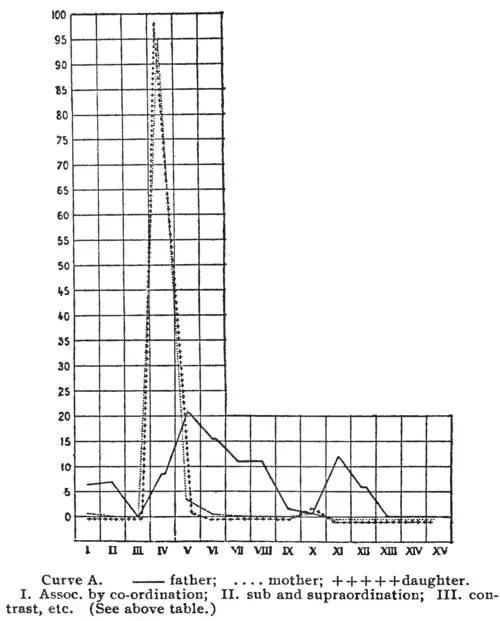 In the curves here reproduced I have marked above the number of associations of each quality in percentages. The Roman letters written below the diagram designate the forms of association indicated in the above tables (see above).