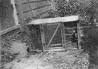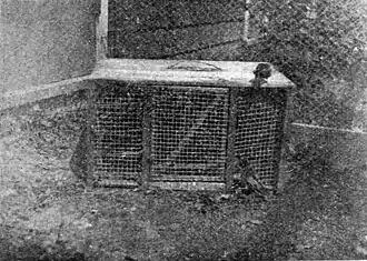 The strings are to the left of the door, Place 2. Male Baltimore Oriole 2, instead of working the strings in the new position, tried the old place, failed, and was here watching Oriole 1 reach through the wire as the latter was accustomed to do earlier.