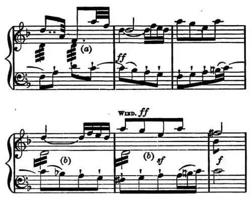 The ben marcato phrase (No. 6) is next given, but with a difference, and on a pedal D, six times over. The second subject (No. 7) follows on this, in D major, and then the various passages and episodes already enumerated, with corresponding changes of key, and important modifications in the distribution of the instruments. At length, the repetition of the first portion of the movement is concluded, not as before in B-flat, but in D minor. And now begins a peroration, or coda, which is so immense in its proportions, so dignified and noble and passionate in its