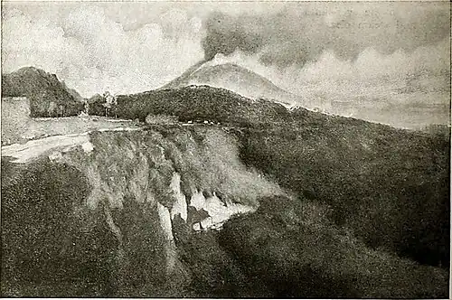 was treacherously soft, with its coating of shifty ash on the ledge of lava overhanging the gulf; so, cautiously braced and bending forward less than a yard from the edge, I got a glimpse of the depths. The muffled muttering was the more impressive because impossible to measure or define. This clamor of unseen forces taps one’s nerves. I could mark the discolored sides of the crater dropping in precipitous incline, seamy, cracked, steaming at points with jets as from escape-valves. I did not linger where at any moment a violent explosion might cause the overhang to slip, as I afterward saw happen. I experienced a thrill, indeed, when, during a visit to Naples in the following year, I learned that the whole ledge upon which I had worked had disappeared within a fortnight of that time.