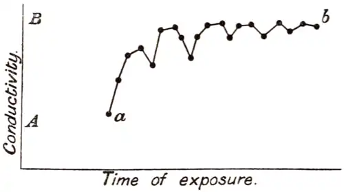 It is remarkable for its regularity. The next figure (fig. 28) gives the curve for iron. The first diminution of resistance is too great to be properly represented in the diagram. Here we have the same type as in the previous case; the inert stage, b, is also more conducting than a; (compare with fig. 26 β).