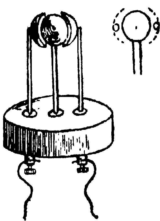 Radiator.—Electric oscillation is produced by sparking between hollow hemispheres, and a small interposed sphere. The two beads attached to the hemispheres and the interposed sphere were at first thickly coated with gold, and the surface highly polished. This worked satisfactorily for a time, but after long-continued action, the surface of the ball became roughened and the discharge ceased to be oscillatory. After some difficulty in obtaining the requisite high temperature, I succeeded in casting a solid ball and two beads of platinum. There is now no difficulty in obtaining an oscillatory discharge; the sparks are made very small, as these are more effective with the receiver used. After a little experience, it is possible to tell whether the discharge is oscillatory or not. The effective sparks have a peculiar smooth sound, whereas non-oscillatory discharges give rise to peculiar cracked sound.