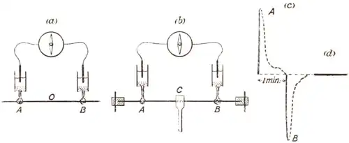 Take a rod of metal, and connect the two points A and B with a galvanometer by means of non-polarisable electrodes. (Fig. 71a.) If the point O is struck, a wave of molecular disturbance will reach A and B. It will be shown that this is attended by a wave of electric variation. The mechanical and the attendant electrical disturbance will reach a maximum and then gradually subside. The resultant effect on the galvanometer will be due to EA − EB where EA and EB are