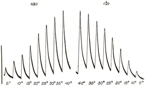 Fig. 79. Photographic records of responses (a) from 5° to 40°, (b) from 40° back to 5°. The vertical line = 0.1 volt.