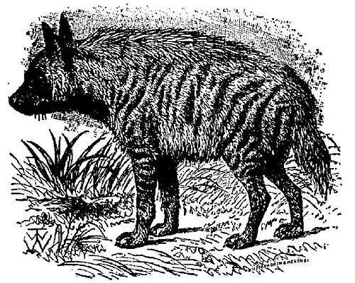 The striped hyena (Hyaena striata) is the most widely distributed species, being found throughout India, Persia, Asia Minor, and North and East Africa, the East African form constituting a distinct race, H. striata schillingsi; while there are also several distinct Asiatic races. The species resembles a wolf in size, and is greyish-brown In colour, marked with indistinct longitudinal stripes of a darker hue, while the legs are transversely striped. The hairs on the body are long, especially on the ridge of the neck and back, where they form a distinct mane, which is continued along the tail. Nocturnal in habits, it prefers by day the gloom of caves and ruins, or of the burrows which it occasionally forms, and issues forth at sunset, when it commences its unearthly howling. When the animal is excited, the howl changes into what has been compared to demoniac laughter, whence the name of “laughing-hyena.” These creatures feed chiefly on carrion, and thus perform useful service by devouring remains which might otherwise pollute the air. Even human dead are not safe from their attacks, their powerful claws enabling them to gain access to newly interred bodies in cemeteries. Occasionally (writes Dr W. T. Blanford) sheep or goats, and more often dogs, are carried off, and the latter, at all events, are often taken alive to the animal’s den. This species appears to be solitary in habits, and it is rare to meet with more than two together. The cowardice of this hyena is proverbial; despite its powerful teeth, it rarely attempts to defend itself. A very different animal is the spotted hyena, Hyaena (Crocuta) crocuta, which has the sectorial teeth of a more cat-like type, and is marked by dark-brown spots on a yellowish ground, while the mane is much less distinct. At the Cape it was formerly common, and occasionally committed great havoc among the cattle, while it did not hesitate to enter the Kaffir dwellings at night and carry off children sleeping by their mothers. By persistent trapping and shooting, its numbers have now been considerably reduced, with the result, however, of making it exceedingly wary, so that it is not readily caught in any trap with which it has had an opportunity of becoming acquainted. Its range extends from Abyssinia to the Cape. The Abyssinian form has been regarded as a distinct species, under the name of H. liontiewi, but this, like various more southern forms, is but regarded as a local race. The brown hyena (H. brunnea) is South African, ranging to Angola on the west and Kilimanjaro on the east. In size it resembles the striped hyena, but differs in appearance, owing to the fringe of long hair covering the neck and fore part of the back. The general hue is ashy-brown, with the hair lighter on the neck (forming a collar), chest and belly; while the legs are banded with dark brown. This species is not often seen, as it remains concealed during the day. Those frequenting the coast feed on dead fish, crabs and an occasional stranded whale, though they are also a danger to the sheep and cattle kraal. Strand-wolf is the local name at the Cape.