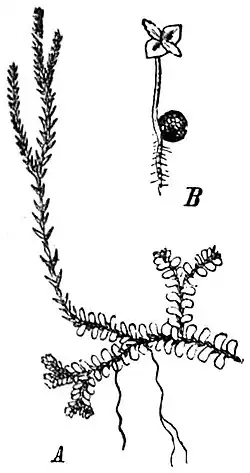 B, S. denticulata, young plant attached to the megaspore (enlarged).