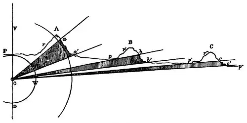seismic vertical, the surface of the earth from which rise three mountain masses in the same right line with , or three parallel mountain ranges, . Of the whole wave , transmitted, the shaded parts are (as respects direct transmission) extinguished at the successive elevations, , , &c. The places situated upon the flanks &c., being free-lying surfaces, are exposed to exalted earthquake action. The places between &c., suffer less as their distances from increase; but those on the plain are abruptly less acted on than those on that ; and these, again, abruptly less than in ; while the places in these