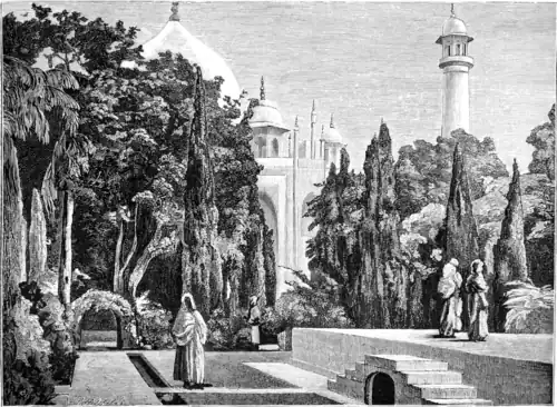 THE GARDEN OF THE TAJ, WITH THE TAJ MAHAL IN THE DISTANCE.