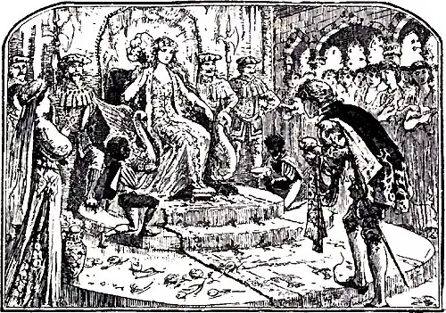 ‘Sir Charming,’ answered she, ‘all the reasons you have given me are very good ones, and I assure you that I should have more pleasure in obliging you than anyone else, but you must know that a month ago as I was walking by the river with my ladies I took off my glove, and as I did so a ring that I was wearing slipped off my finger and rolled into the water. As I valued it more than my kingdom, you may imagine how vexed I was at losing it, and I vowed never to listen to any proposal of marriage unless the ambassador first brought me back my ring. So now you know what is expected of you, for if you talked for fifteen days and fifteen nights you could not make me change my mind.’